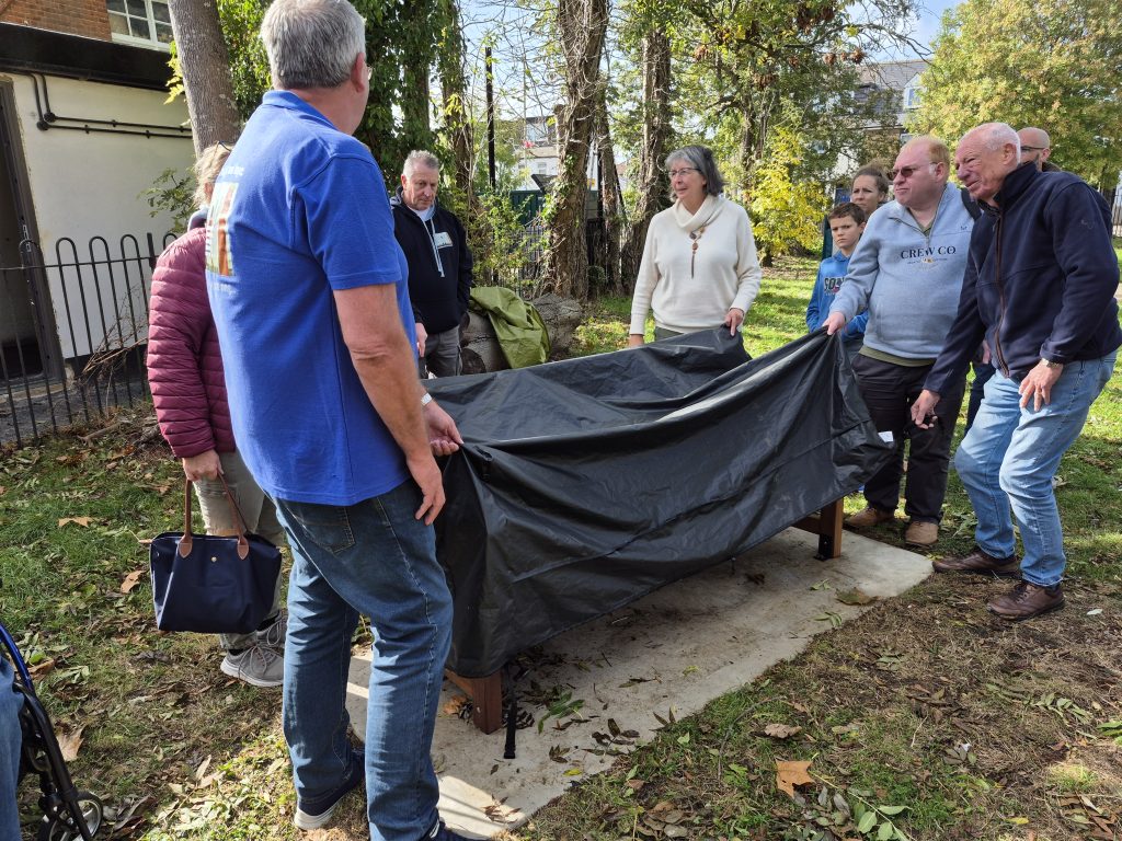 Willing hands shared the task of unveiling the bench with representatives from some of the sponsoring groups.