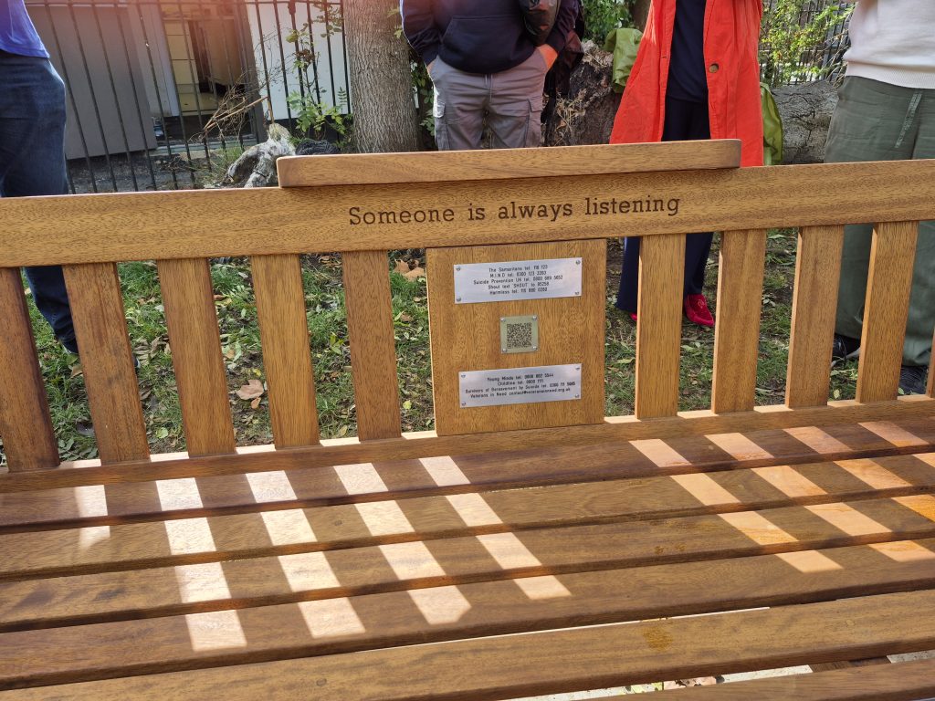 The bench is provided with a solar powered light and has a number of inscriptions which offer help to any who have mental health issues or are considering suicide.